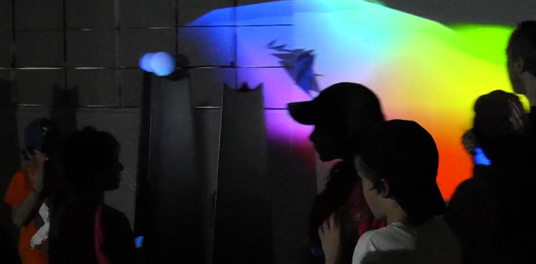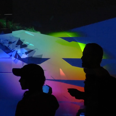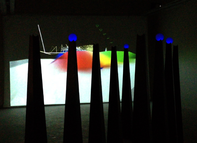 It intends to explore the perception of the virtual space, relating it to the sculptural geometry of the physical space, combining them through the enjoyment of sounds and images that are created in realtime according to the choices the visitor makes.